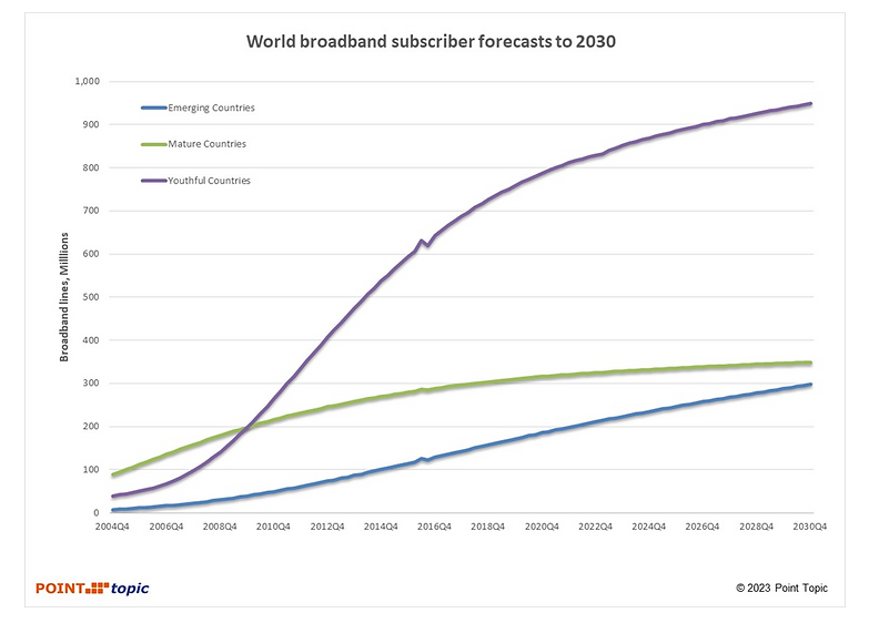 Figure 2. Forecast of global fixed broadband subscriber lines to 2030 by market type. Source: Point Topic.