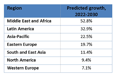 在全球地區(qū)中,西歐將位居第二,預(yù)計(jì)到2030年固定寬帶用戶將達(dá)到1.8億。盡管預(yù)計(jì)增長(zhǎng)率最高,但中東和非洲仍將是最小的固定寬帶市場(chǎng),用戶數(shù)僅為8000萬(wàn)。