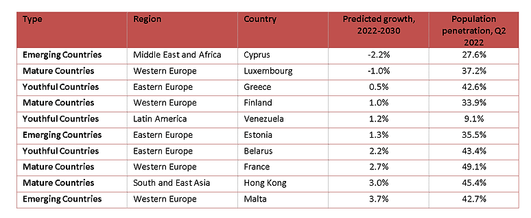 其他預(yù)測(cè)增長(zhǎng)率最低的國(guó)家包括固定寬帶普及率較高的市場(chǎng),如法國(guó)、香港和馬耳他,以及社會(huì)經(jīng)濟(jì)條件不太有利于寬帶投資和采用的市場(chǎng),如委內(nèi)瑞拉,盡管普及率較低。