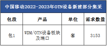 ICC訊 6月1日,中國(guó)移動(dòng)發(fā)布2022-2023年OTN設(shè)備新建部分集中采購(gòu)項(xiàng)目公告,本期集中采購(gòu)產(chǎn)品為OTN設(shè)備(WDM/OTN設(shè)備板塊及端口),預(yù)估采購(gòu)OTN設(shè)備線路側(cè)端口467個(gè),客戶側(cè)端口2686個(gè),合計(jì)3153套。采購(gòu)量以實(shí)際合同為準(zhǔn)。