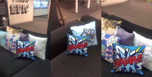 通過這個(gè)AR軟件,用戶可以從商店中選擇抱枕,然后打開iPhone攝像頭,在沙發(fā)上點(diǎn)擊需要擺放的地方,抱枕便會(huì)放到相應(yīng)的位置,還可以360度觀看抱枕是否與沙發(fā)和其他物件搭配。