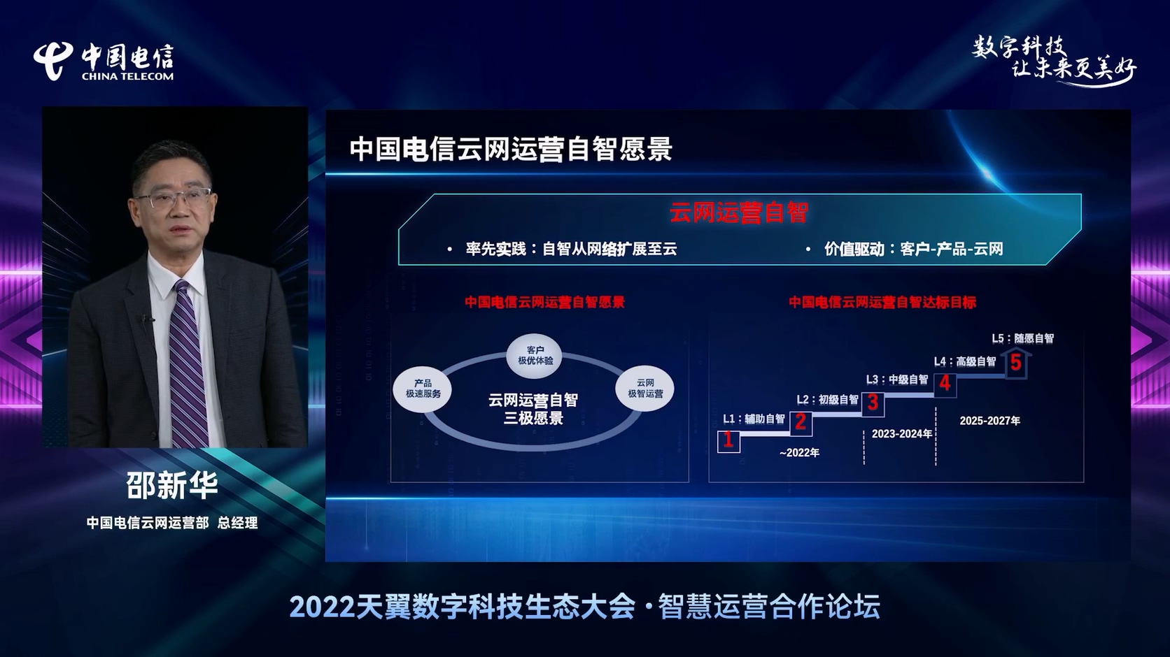 12月29日,2022天翼數(shù)字科技生態(tài)大會在云端開幕,同期舉辦的以“智慧運營賦能產(chǎn)數(shù),卓越昆侖合作共贏”為主題的智慧運營合作論壇上,中國電信云網(wǎng)運營部(大數(shù)據(jù)和AI中心)總經(jīng)理邵新華系統(tǒng)介紹了中國電信在云網(wǎng)運營自智領(lǐng)域的思考以及實踐經(jīng)驗。