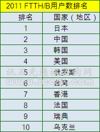 日本FTTH/B用戶數(shù)依舊保持世界第一,中國緊隨其后。但在增長上,這兩個國家則呈現(xiàn)出明顯不同。中國的表現(xiàn)更為積極, 2011年下半年較上半年增長44%,而日本僅有6%。這一趨勢只會變得更強,因為在2011上半年,各自的增長率為14%和5%。這一趨勢將很快在擁有最多FTTH/B用戶數(shù)全球排名上,使得中國和日本調換位置。