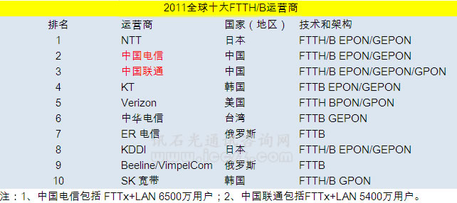 領先者為現(xiàn)任日本運營商NTT,其FTTH/B用戶數(shù)在2011年底達1600萬戶。緊隨其后的為中國兩大運營商,中國電信和中國聯(lián)通,這兩家也正在部署FTTx+LAN架構。但是,如果你考慮到所有的FTTx架構,這兩家中國公司則超過了目前的NTT,因NTT在高速寬帶用戶群上已相對停滯。中國市場似乎在光纖部署上增長強勁。例如,2011下半年中國聯(lián)通在FTTH/B家庭覆蓋數(shù)上相對于上半年增長了177%,而它的競爭者則增長了80%。