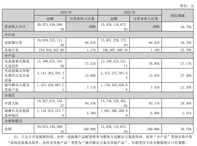 其中,2023年的營(yíng)業(yè)收入構(gòu)成分行業(yè)來(lái)看,連接器行業(yè)實(shí)現(xiàn)營(yíng)收198.4億元,同比增長(zhǎng)98.82%;其他行業(yè)2.35億元,同比增長(zhǎng)1.18%。分產(chǎn)品來(lái)看,光連接器及集成互連組件在2023年實(shí)現(xiàn)營(yíng)業(yè)收入31.47億元,同比增長(zhǎng)15.62%。