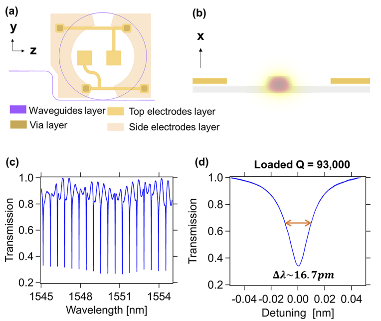 圖1 (a) AFC器件示意圖。波導(dǎo)層由直波導(dǎo)和環(huán)形諧振器組成。側(cè)電極沿鈮酸鋰的晶體 z 軸產(chǎn)生電場(chǎng)。(b) 總線波導(dǎo)的基本 TE 模式的橫截面。(c) 測(cè)量光譜。(d) 放大 1551.75 nm 處的共振峰。FWHM由在共振的最大值和最小值之間的中點(diǎn)計(jì)算。