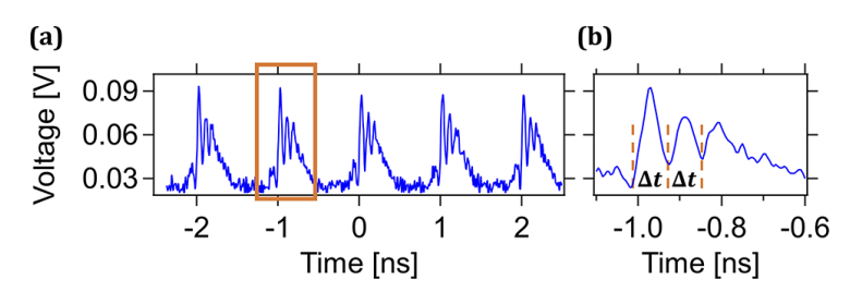 圖3 (a) 觀察到的信號(hào)模式。(b) 跳動(dòng)信號(hào)的放大視圖。我們通過測(cè)量差拍周期 Δt 來計(jì)算轉(zhuǎn)換波長(zhǎng)。[圖片來源:Optics Letters (Volume: 47, Issue: 22]
