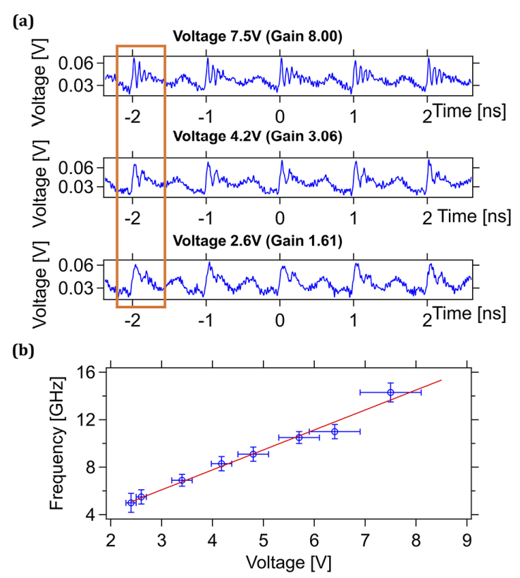 圖4 (a) 當(dāng)我們降低電壓時(shí),節(jié)拍信號(hào)會(huì)拉伸。(b) 頻移隨施加電壓的變化而變化。[圖片來源:Optics Letters (Volume: 47, Issue: 22]