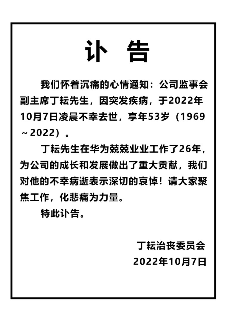 心聲社區(qū)發(fā)布的訃告稱,“丁耘先生在華為兢兢業(yè)業(yè)工作了26年,為公司的成長和發(fā)展做出了重大貢獻,我們對他的不幸病逝表示深切的哀悼!請大家聚焦工作,化悲痛為力量”。