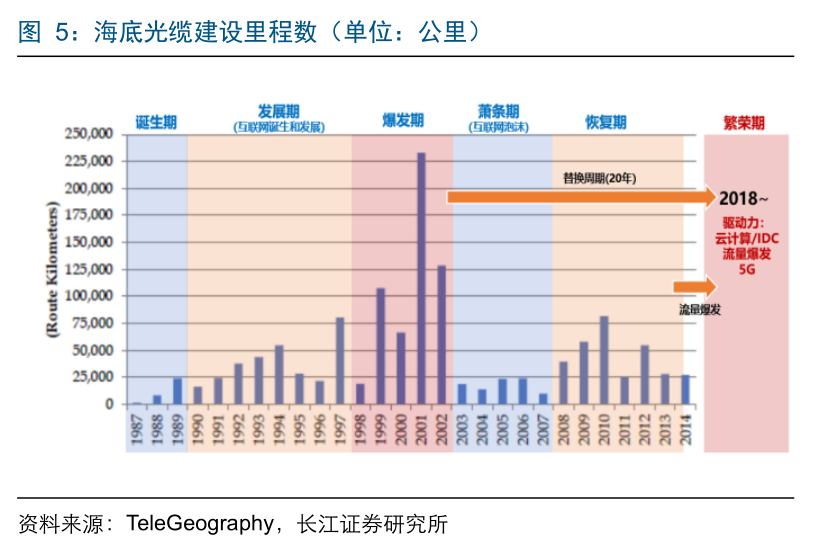 海底光纜的壽命一般在25年左右,大約20年左右為一個使用周期。根據(jù)TeleGeography數(shù)據(jù),1998-2002年為歷史上第一個海纜建設(shè)爆發(fā)期,5年共鋪設(shè)海纜50~60萬公里,鋪設(shè)海纜規(guī)模從1997年的8萬公里左右提升至高峰時23萬公里/年。而這一波鋪設(shè)高峰預(yù)計將在2018-2022年將迎來一波替換高峰。