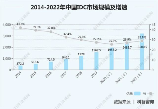 科智咨詢(xún)發(fā)布報(bào)告顯示,2019年,中國(guó)IDC業(yè)務(wù)市場(chǎng)規(guī)模達(dá)到1562.5億元,同比增長(zhǎng)27.2%。報(bào)告預(yù)計(jì),2019-2022年,中國(guó)IDC業(yè)務(wù)市場(chǎng)規(guī)模復(fù)合增長(zhǎng)率為26.9%;到2022年,市場(chǎng)規(guī)模將超過(guò)3200.5億元,同比增長(zhǎng)28.8%,進(jìn)入新一輪爆發(fā)期。