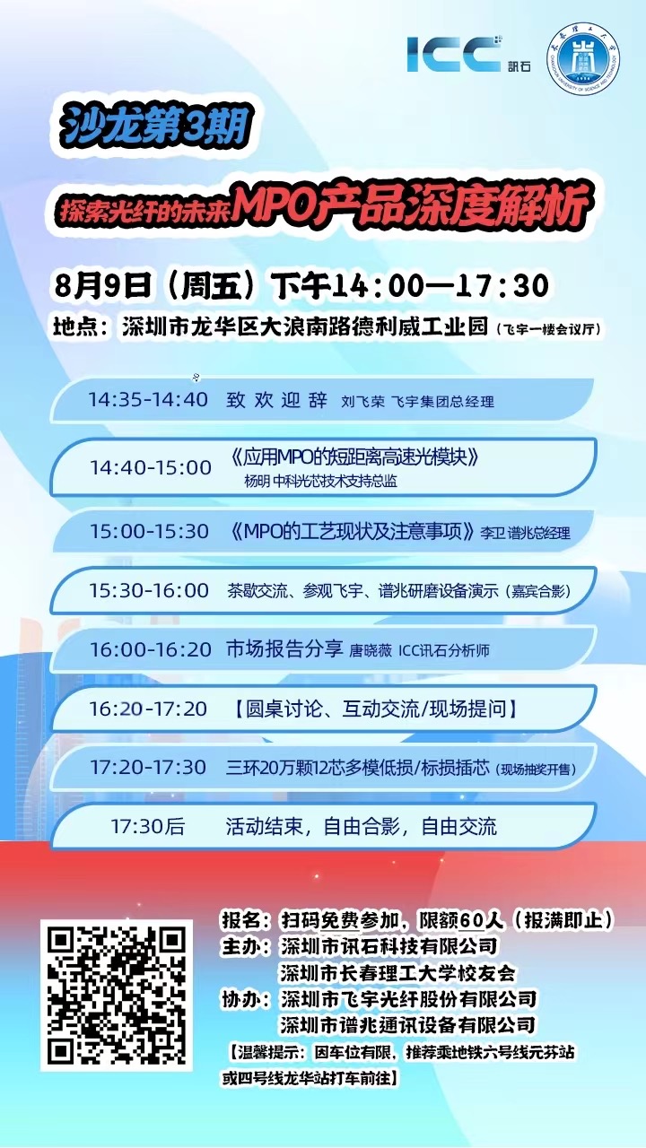 2024年8月9日下午,ICC訊石沙龍第3期《探索光纖的未來(lái)—MPO產(chǎn)品深度解析》將圍繞MPO技術(shù)的產(chǎn)品結(jié)構(gòu)、產(chǎn)品生產(chǎn),以及MPO市場(chǎng)緊缺性、工藝創(chuàng)新性,結(jié)合應(yīng)用案例及最新進(jìn)展進(jìn)行互動(dòng)探討。誠(chéng)邀廣大光電連接器、網(wǎng)絡(luò)工程、技術(shù)解決方案及數(shù)據(jù)中心互聯(lián)專家及人士免費(fèi)報(bào)名參加,名額有限報(bào)滿即止哦。