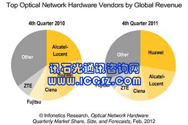 在4Q11,大型光網(wǎng)絡設(shè)備商增長最多--除了思科以外--包括華為(增長35%)、阿爾卡特朗訊(增長20%)和Ciena(增長10%);