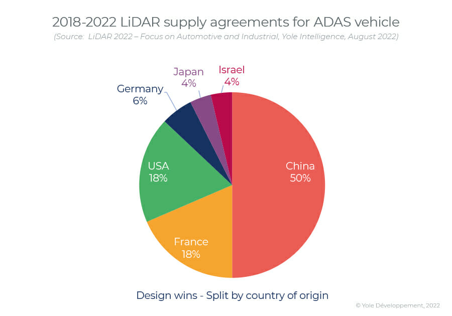 而工業(yè)與汽車應用LiDAR市場誕生了新的競爭者,包括中國公司。2018年公布的55項汽車應用設(shè)計采納有半數(shù)來自中國和以下LiDAR制造商,包括禾賽科技、速騰聚創(chuàng)、華為和覽沃(大疆)。中國不僅發(fā)展出高質(zhì)量的LiDAR技術(shù)和LiDAR工廠,還形成一套完整的生態(tài)產(chǎn)業(yè)鏈,包括半導體元器件、軟件和集成商。