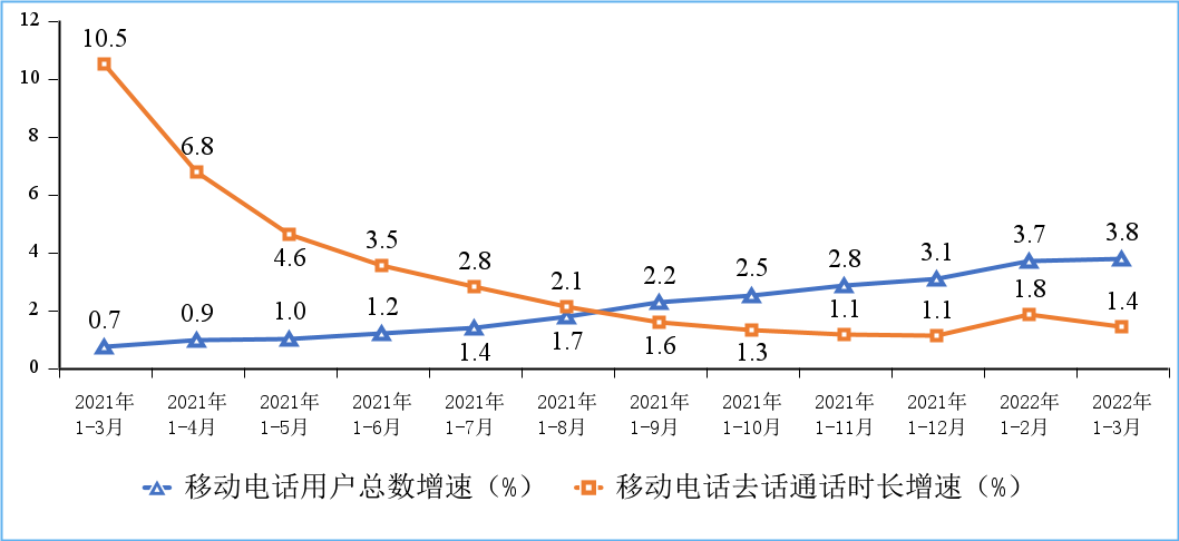 移動電話通話量低速增長,移動短信業(yè)務量收均增長。一季度,移動電話去話通話時長完成5445億分鐘,同比增長1.4%;固定電話主叫通話時長完成197億分鐘,同比下降12.8%。一季度,全國移動短信業(yè)務量同比增長3.6%;移動短信業(yè)務收入同比增長3.1%。