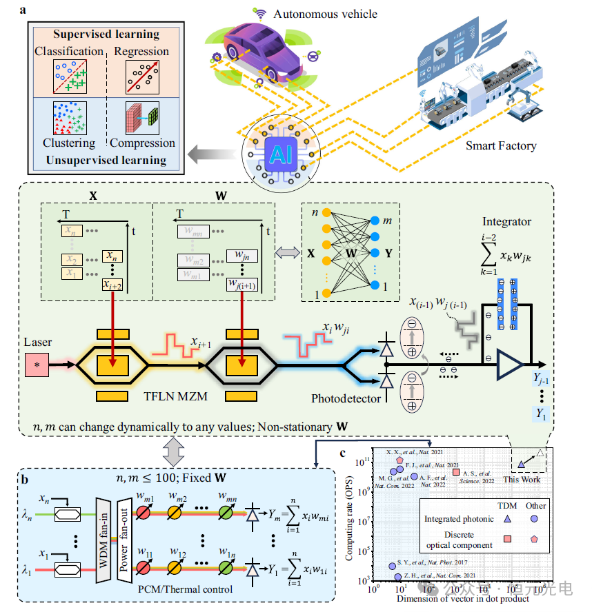 圖1 集成光子張量核心(IPTC)的概念。a頂部:人工智能(AI)AI系統(tǒng)的應用和功能要求處理器能夠適應各種AI任務,底部:IPTC的示意圖。b基于傳統(tǒng)波分復用(WDM)的IPTC的示意圖。c設備的性能與幾種最先進的光子張量核心的性能的比較