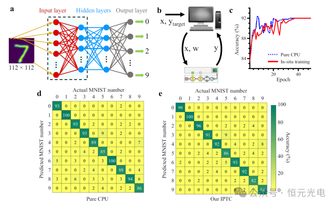 分類是一項監(jiān)督學習AI任務,需要標記數(shù)據(jù)來訓練模型。該團隊構建的多層感知器模型使用IPTC執(zhí)行前向傳播的原位訓練方案(見圖4b)用2000個標記的數(shù)字圖像進行訓練。同時,電子計算機處理非線性函數(shù)和反向傳播。權重向量通過隨機梯度下降法進行更新,允許迭代訓練單個樣本。重復從前向傳播到反向傳播的訓練過程,直到收斂。圖4c顯示了與僅在中央處理單元(CPU)上運行相比,現(xiàn)場訓練方案的驗證精度隨時間的變化。