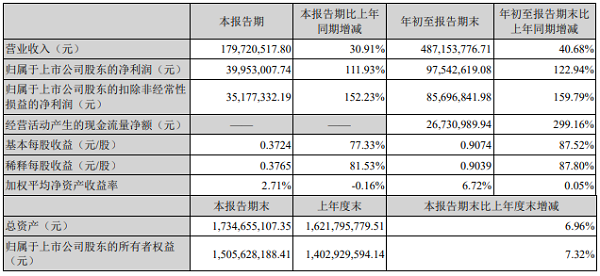 ICC訊(編輯:Nina)近日,珠海光庫(kù)科技股份有限公司(以下簡(jiǎn)稱“光庫(kù)科技”或“公司”)發(fā)布了2021年第三季度報(bào)告。本報(bào)告期內(nèi),公司實(shí)現(xiàn)營(yíng)業(yè)收入1.80億元,同比增長(zhǎng)30.91%;實(shí)現(xiàn)歸屬于上市公司股東的凈利潤(rùn)3995.30萬(wàn)元,同比增長(zhǎng)111.93%。