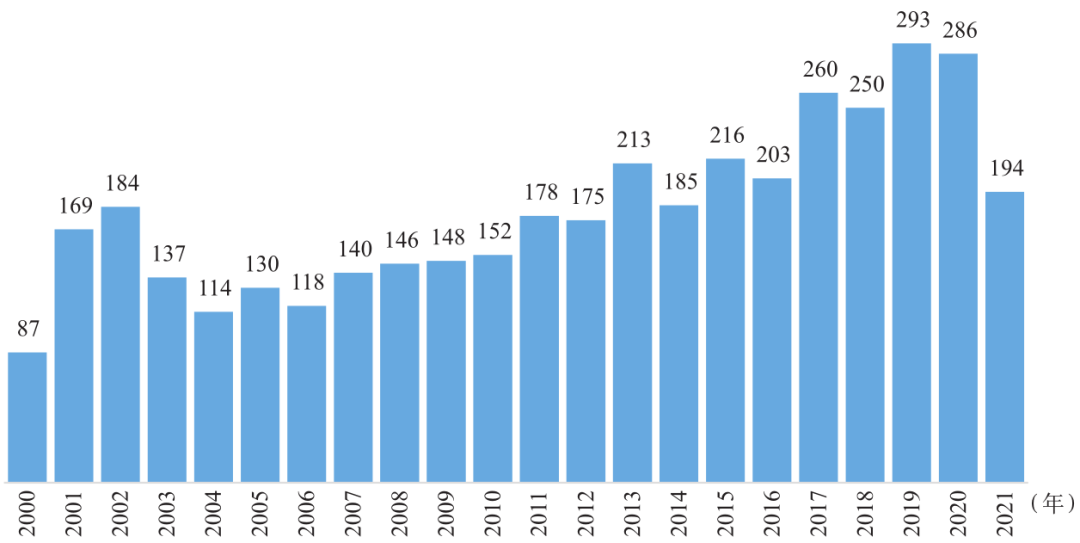 圖1 DFB激光器近20年全球?qū)@甓壬暾堏厔?單位:項)