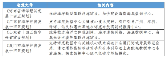 2021年以來,國家發(fā)改委、工信部等部門先后出臺了《貫徹落實碳達峰碳中和目標要求推動數(shù)據(jù)中心和5G等新型基礎(chǔ)設(shè)施綠色高質(zhì)量發(fā)展實施方案》《“十四五”工業(yè)綠色發(fā)展規(guī)劃》等,鼓勵探索利用河湖、海洋等優(yōu)勢資源,建設(shè)利用自然冷源散熱的數(shù)據(jù)中心,充分發(fā)揮氣候水文和地形地貌等自然條件天然優(yōu)勢,因地制宜促進數(shù)據(jù)中心節(jié)能降耗。例如,沿海多省市計劃開展UDC項目,海南省、山東省、廣東省、廈門市等提出的海洋經(jīng)濟發(fā)展“十四五”規(guī)劃明確提出支持UDC等基礎(chǔ)設(shè)施建設(shè),海底數(shù)據(jù)中心迎來發(fā)展機遇,注重自然環(huán)境成為數(shù)據(jù)中心選址的重要考慮因素。