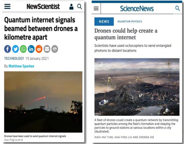 英國的《新科學(xué)家》雜志則評價(jià),在這個(gè)工作中,人們首次實(shí)現(xiàn)了移動節(jié)點(diǎn)間自由空間量子鏈路的搭建,作者援引倫敦帝國理工學(xué)院Myungshik Kim的評論指出:“將如此復(fù)雜的光學(xué)器件集成進(jìn)移動的無人機(jī),在移動過程中實(shí)現(xiàn)量子連接,這無疑增加了實(shí)現(xiàn)難度,這是一項(xiàng)重大的技術(shù)進(jìn)步?!?