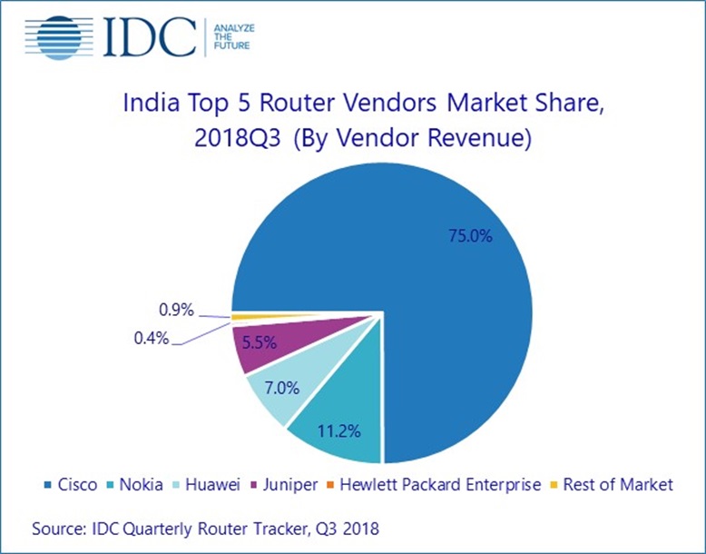 印度Q318的路由器市場收入達(dá)2.15億美元(按供應(yīng)商收入計(jì)算),同比增長140.4%。 增長主要來自服務(wù)提供商細(xì)分市場。電信運(yùn)營商不斷投資網(wǎng)絡(luò)升級,以滿足日益增長的4G VoLTE足跡需求。 隨著5G路線圖和商業(yè)化的推出,服務(wù)提供商細(xì)分市場預(yù)計(jì)將在未來幾年繼續(xù)增長。截至2018年第三季度,思科占路由器市場的3/4。由于電信領(lǐng)域的一些重大勝利,諾基亞和華為同比增長達(dá)到兩位數(shù)。