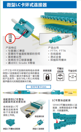 除了這兩款新產(chǎn)品外,扇港還展示了一款微型LC卡環(huán)式連接器。該產(chǎn)品可以應(yīng)用于FTTH、FTTA、在線面板、測試設(shè)備和即插即用模塊等各種應(yīng)用場合。它能與普通LC兼容,小尺寸及卡環(huán)式連接的獨特組合使得其成為背墻式應(yīng)用等高密度應(yīng)用的最佳選擇。聶經(jīng)理表示這款微型LC卡環(huán)式連接器已經(jīng)開始量產(chǎn),并且很受系統(tǒng)廠商的歡迎。