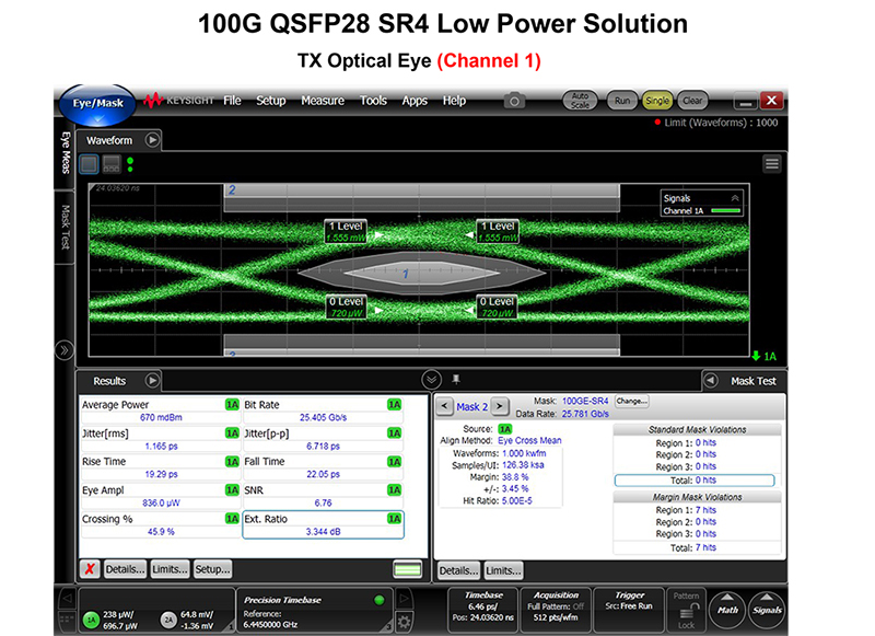 第二代低功耗100G QSFP28 SR4在CDR工作的條件下,其室溫功耗為2W,高溫70℃功耗為2.2W,滿足SFF-8436 V4.8 ?MSA Power level 3中MAX POWER 2.5W功耗檔次。符合IEEE 802.3bm 100GBASE SR4、InfiniBand EDR?、32GFC等協(xié)議標(biāo)準(zhǔn),同時(shí)向下兼容10GE,完全滿足OM3 光纖75米傳輸和OM4光纖100米傳輸應(yīng)用。實(shí)際測(cè)試環(huán)境中,依據(jù)更嚴(yán)格的誤碼率測(cè)試標(biāo)準(zhǔn)(<-15次方), 傳輸100米的OM4光纖沒有發(fā)現(xiàn)任何誤碼。100G QSFP28 SR4采用易飛揚(yáng)自主研制的透鏡與光引擎技術(shù),集成了收發(fā)雙向8路25Gbps的數(shù)據(jù)通道,支持?jǐn)?shù)字診斷功能。100G QSFP28 SR4模塊擁有優(yōu)秀的光眼圖、接收靈敏度和電眼抖動(dòng)性能。
