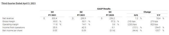 2021財(cái)年第三季度,VIAVI銷售收入3.03億美元;GAAP毛利率60.0%,非GAAP毛利率63.1%;GAAP凈收入1180萬美元,或每股盈利5美分,非GAAP凈收入4230萬美元,或每股盈利18美分。2021財(cái)年第二季度,公司銷售收入約3億美元;GAAP毛利率60.1%,非GAAP毛利率63.1%;GAAP凈收入2190萬美元,或每股盈利9美分,非GAAP凈收入5210萬美元,或每股盈利23美分。2020財(cái)年第三季度,公司銷售收入2.56億美元;GAAP毛利率57.3%,非GAAP毛利率61.2%;GAAP凈虧損3280萬美元,或每股虧損14美分,非GAAP凈收入3200萬美元,或每股盈利14美分。