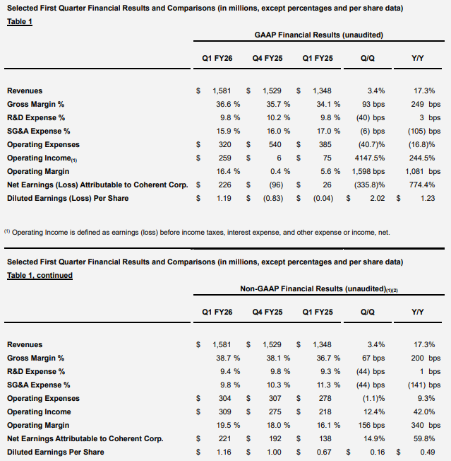 ICC訊 2025年11月5日,Coherent Corp. 公布其2026財年第一季度財務業(yè)績。截至2025年9月30日,公司營收為15.8億美元,GAAP毛利潤率為36.6%,GAAP凈收入為每股攤薄收益1.19美元。在非GAAP基礎上,毛利潤率為38.7%,每股攤薄收益為1.16美元。