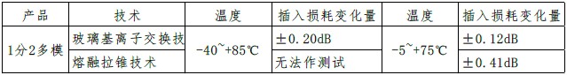 玻璃基離子交換型多模光分路器工作溫度在-40~+85℃,插入損耗隨溫度變化而變化量較小;熔融拉錐型多模光分路器通常工作溫度在-5~+75℃,插入損耗隨溫度變化的變化較大,特別是在低溫條件下(<-10℃),插入損耗較不穩(wěn)定。為了保持其性能的穩(wěn)定性,會(huì)增加能源消耗,而玻璃基離子交換型則沒有這個(gè)問題。