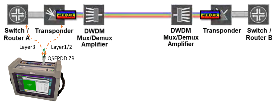 現(xiàn)網(wǎng)ZR設(shè)備建設(shè)與開通:在部署和開通階段可以采用ONA1000便攜式儀表進(jìn)行QSFPDD ZR的驗證測試: