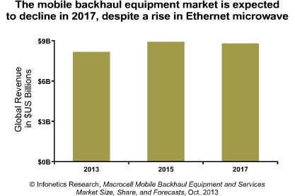 Infonetics預(yù)計2013年全球宏蜂窩移動回程設(shè)備市場將到達81億美元,同比2012年僅增長1%;