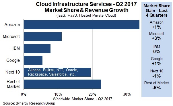 圖2:2017年第二季度,云基礎(chǔ)設(shè)施服務(wù)市場份額和營收增長數(shù)據(jù)