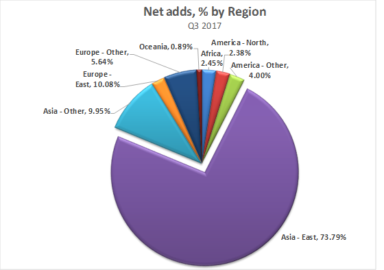 近四分之三的寬帶凈增用戶來自東亞。這主要是受中國(guó)的持續(xù)增長(zhǎng)推動(dòng)的,中國(guó)Q317新增了1500萬寬帶用戶。