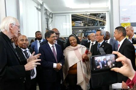 舉行投產儀式之前,在亨通南非阿伯代爾電纜(Aberdare Cables)CEO宋海燕博士等的陪同下,林松添大使和帕特爾部長等一行參觀考察了工廠新投資的設備和車間。公司嶄新的車間和先進的設備以及中南互利合作模式受到南方一致稱贊。