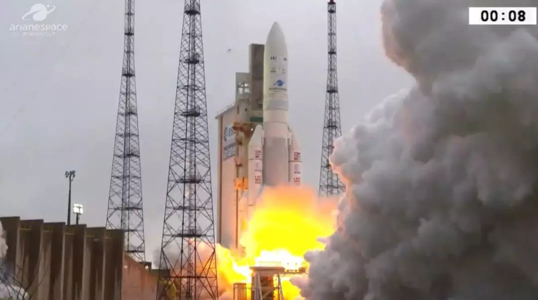 ICCSZ訊 綜合消息,阿里安航天公司的阿里安5ECA型運(yùn)載火箭2月5日在法屬圭亞那庫(kù)魯發(fā)射了阿拉伯衛(wèi)星通信組織所屬希臘衛(wèi)星公司的“希臘星”4/“沙特靜地星”(SGS)1和印度空間研究組織(ISRO)的“靜地星”31通信衛(wèi)星。這是阿里安公司今年的首次發(fā)射?;鸺诋?dāng)?shù)貢r(shí)間18時(shí)01分(北京時(shí)間6日5時(shí)01分)點(diǎn)火起飛,42分鐘后完成星箭分離。