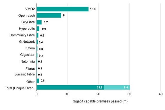 在英國(guó)領(lǐng)先部署千兆網(wǎng)絡(luò)的是Virgin Media,它覆蓋的場(chǎng)所數(shù)量是排名第二的Openreach 的兩倍多(見(jiàn)上圖)。