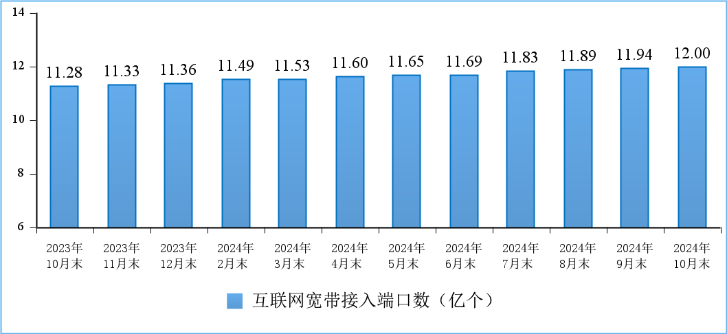 截至10月末,全國互聯(lián)網(wǎng)寬帶接入端口數(shù)量達(dá)12億個(gè),比上年末凈增6370萬個(gè)。其中,光纖接入(FTTH/O)端口達(dá)到11.6億個(gè),比上年末凈增6141萬個(gè),占互聯(lián)網(wǎng)寬帶接入端口的96.4%。截至10月末,具備千兆網(wǎng)絡(luò)服務(wù)能力的10G PON端口數(shù)達(dá)2761萬個(gè),比上年末凈增458.6萬個(gè)。截至10月末,5G基站總數(shù)達(dá)414.1萬個(gè),比上年末凈增76.4萬個(gè),占移動(dòng)基站總數(shù)的32.8%,占比較上年末提高3.7個(gè)百分點(diǎn)。