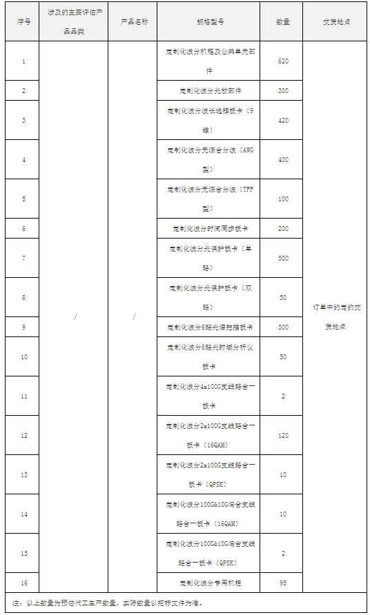 申請人需具備在國內(nèi)生產(chǎn)傳輸承載類產(chǎn)品(DCI-BOX、DWDM/OTN/ROADM、SDH/MSTP、MSAP、IPRAN、PTN、STN-A/B/ER、接入型OTN)(任一產(chǎn)品品類)的代工生產(chǎn)能力,且在2020年1月1日至2022年4月15日在國內(nèi)的生產(chǎn)銷售或代工(任一產(chǎn)品品類)總金額超過3000萬元。