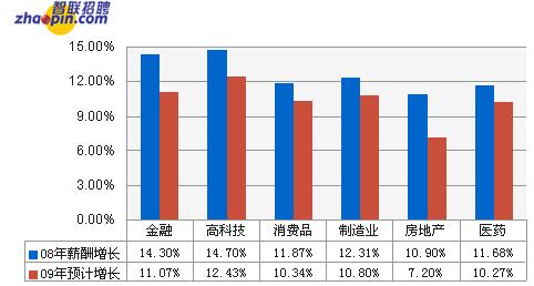 2008年企業(yè)漲薪幅度平均為13.8%,其中高科技行業(yè)漲薪幅度為14.7%,位列第一。金融行業(yè)漲薪幅度略低于高科技行業(yè),為14.3%,位列第二。制造業(yè)漲薪幅度為12.31%,位列第三。受到金融危機影響,70%企業(yè)對于此前的2009年度
