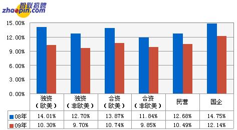 國有企業(yè)漲薪幅度穩(wěn)居第一。外商獨資(歐美企業(yè))以及合資(歐美企業(yè))受金融危機影響最大,09年預(yù)計漲薪幅度較08年漲薪幅度分別下滑了3.29%及3.13%,為10.3%及10.74%。民營企業(yè)的漲薪幅度與合資(歐美企業(yè))差距較小,為10.49%。而外商獨資(非歐美企業(yè))及合資(非歐美企業(yè))均將到10%以下,分別為9.7%及9.85%