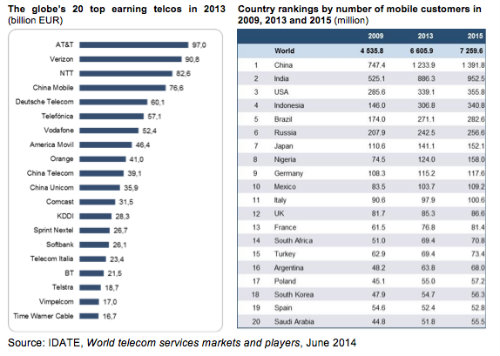 從上圖可看出,全球營收規(guī)模最大的運營商前三名分別為AT&T、Verizon、NTT,而中國移動排名第四,中國電信和中國聯(lián)通分別位列第10和第11位。在移動用戶數(shù)方面,截止2013年底,中國穩(wěn)居第一位(12.33億戶),遠超第二位的印度(8.06億戶),第三位則為美國(3.39億戶)。