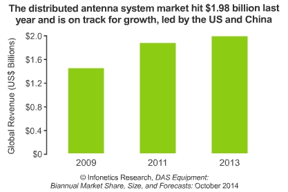 ICCSZ訊 2014年10月28日,市場調研公司Infonetics發(fā)布其最新的關于分布式天線系統(tǒng)(DAS)市場報告。