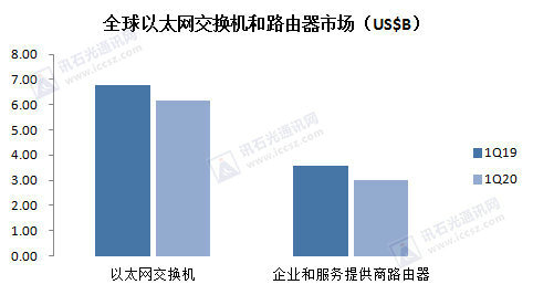2020年第一季度,全球企業(yè)和服務(wù)提供商路由器市場(chǎng)同比下降16.4%,其中占75.1%收入的服務(wù)提供商板塊同比下降16.8%,剩下的企業(yè)板塊同比下降15.3%。