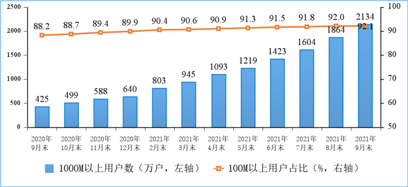 圖3 2020年-2021年9月份末100M速率以上、1000M速率以上的固定互聯(lián)網寬帶接入用戶情況