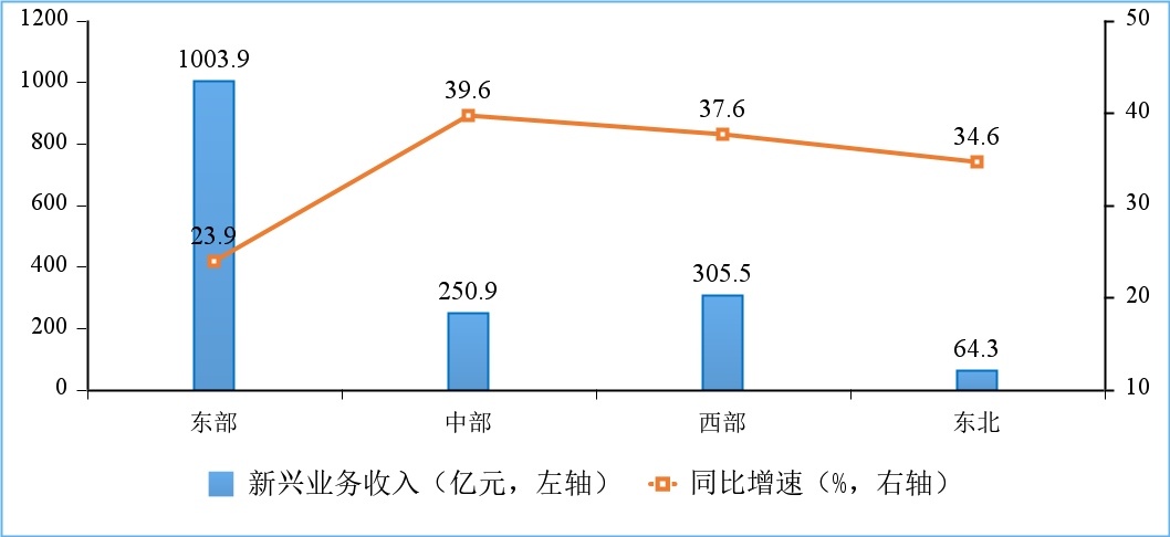 東部地區(qū)新興業(yè)務發(fā)展領先,中西部地區(qū)增長迅猛。前三季度,東、中、西部和東北地區(qū)分別完成新興業(yè)務收入1004億元、251億元、306億元和64.3億元,同比分別增長23.9%、39.6%、37.6%和34.6%;在電信業(yè)務收入中的占比分別達到18%、