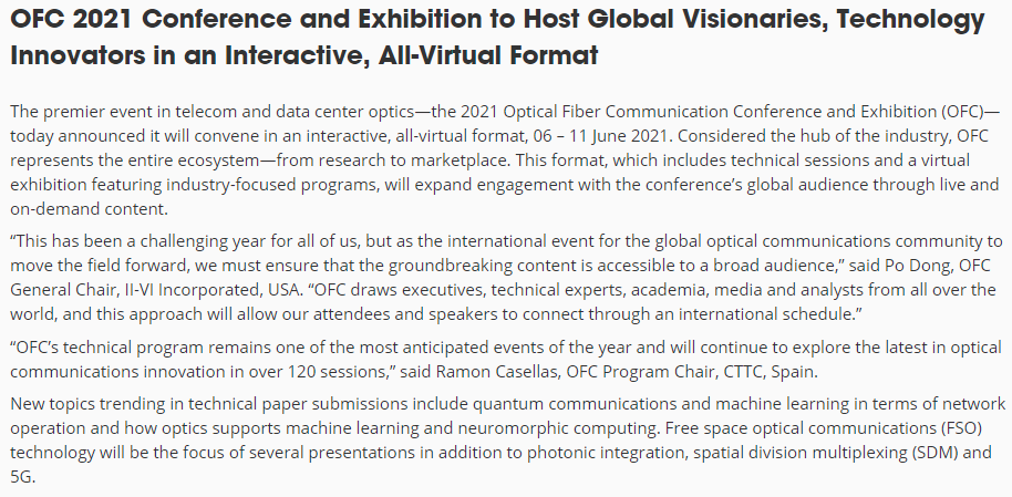 ICC訊 日前,光通信行業(yè)盛會(huì)OFC組委會(huì)宣布,2021年的OFC將以交互式、全虛擬的形式召開(kāi),包括展會(huì)和技術(shù)交流會(huì)議,都將通過(guò)直播和點(diǎn)播的形式進(jìn)行。一直以來(lái),OFC被認(rèn)為是行業(yè)的中心,代表了光通信行業(yè)從研究到市場(chǎng)的整個(gè)產(chǎn)業(yè)生態(tài),今年的會(huì)議將在2021年6月6日至11日舉行。