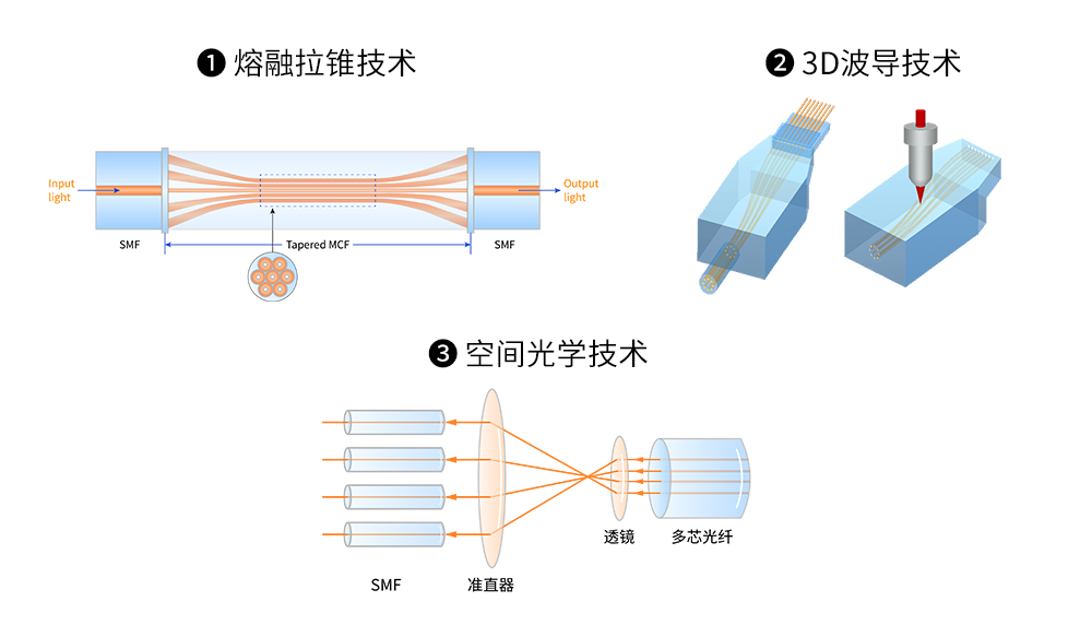 在多芯光纖(MCF)的應(yīng)用中,空間多路復(fù)用器/解復(fù)用器被稱為扇入/扇出(FIFO)器件,用于有效地將光從單個(gè)單模光纖耦合到多核光纖的每個(gè)核心,反之亦然。到目前為止,已經(jīng)報(bào)道了各種各樣的FIFO器件實(shí)現(xiàn)技術(shù),但最常用的技術(shù)有: 1)熔融拉錐技術(shù),2)3D波導(dǎo)技術(shù);和3)自由空間光學(xué)技術(shù)。