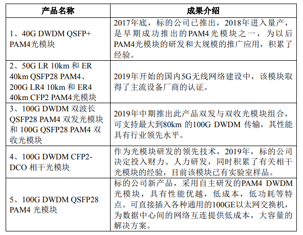 標的公司光模塊產(chǎn)品的研發(fā)著眼于將新型的光調(diào)制技術(shù),如 PAM4,相干光等,以及應(yīng)用于小型化的高速光模塊等。標的公司已實現(xiàn)產(chǎn)品化的研究成果如下:
